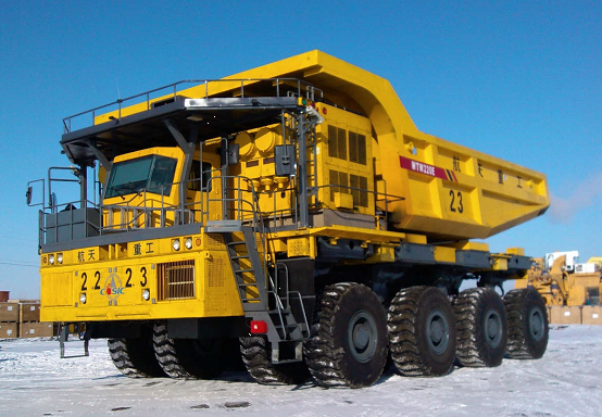 新型節(jié)能多軸重型礦用自卸車,已經(jīng)載重220噸進行了2000公里的路面各項試驗,在內(nèi)蒙古露天礦克服當(dāng)?shù)亓阆滤氖鹊膼毫犹鞖鈼l件,每天分三班正式運行。該車采用4軸線、8個懸架、16×16輪驅(qū)動、輪轉(zhuǎn)向等結(jié)構(gòu)形式,綜合運用了雙發(fā)動機聯(lián)合動力、車輪立電驅(qū)動技術(shù)、大行程液壓懸架、擺動軸技術(shù)、箱型車架、液壓制動和轉(zhuǎn)向、遠程監(jiān)控自動診斷等先進技術(shù),提高了車輛道路適應(yīng)性,降低了道路維護頻次和成本,延長了輪胎壽命,同時具有轉(zhuǎn)彎半徑小、機動性能好、供貨周期短、采購及維護成本低等優(yōu)點,別適應(yīng)于大中型露天礦山開采運輸和大型工程施工。